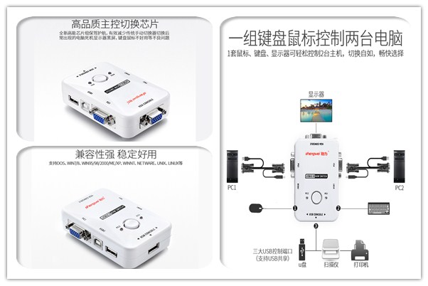 KS-302A KVM切換器,此類產(chǎn)品之所以能夠受到客戶的青睞,主要是因?yàn)樗捎?span style="color:#E53333;">全新高能芯片組保駕護(hù)航,有效減少傳統(tǒng)手動切換器切換后,常出現(xiàn)的電腦死機(jī)顯示器黑屏,鍵盤鼠標(biāo)不好用等不良問題。而且它還支持即插即用,無需外置電源,支持無線鍵鼠,支持USB設(shè)備共享。
