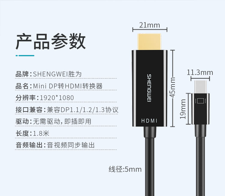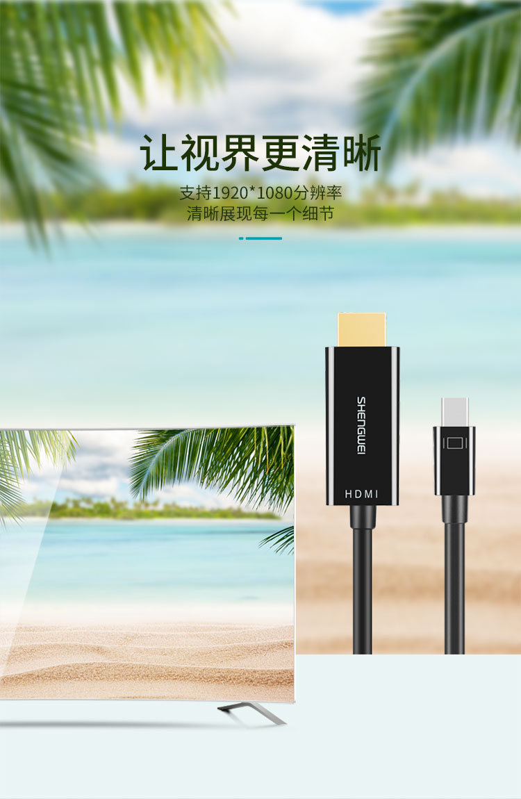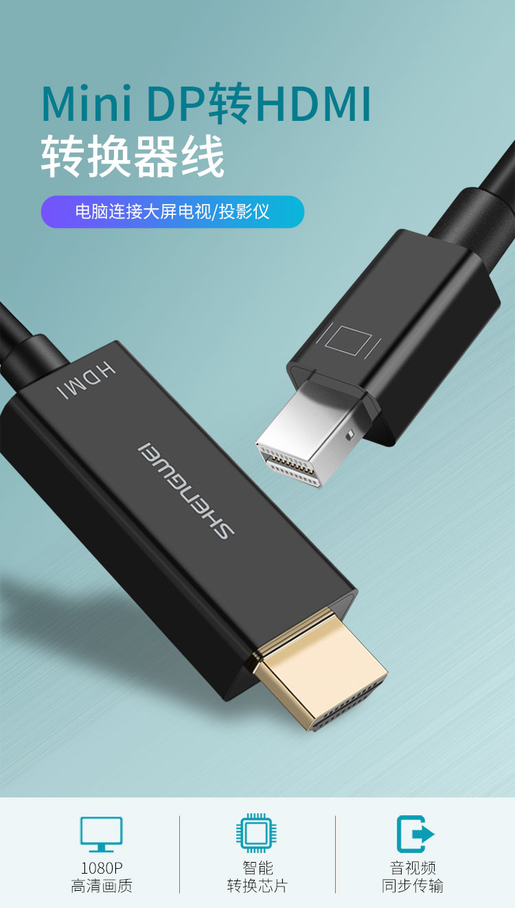 勝為Mini-DP轉(zhuǎn)HDMI轉(zhuǎn)換器 surface/蘋果筆記本雷電接口高清4K 雷電轉(zhuǎn)HDMI公口-1080P 1.8米 MN-3080