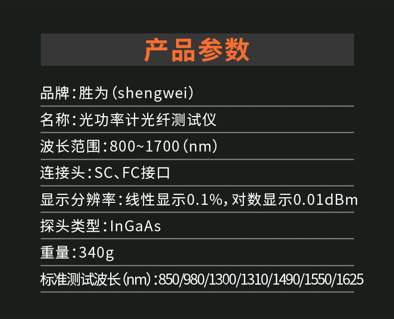 標(biāo)準(zhǔn)測試波長(nm):850/980/1300/1310/1490/1550/1625