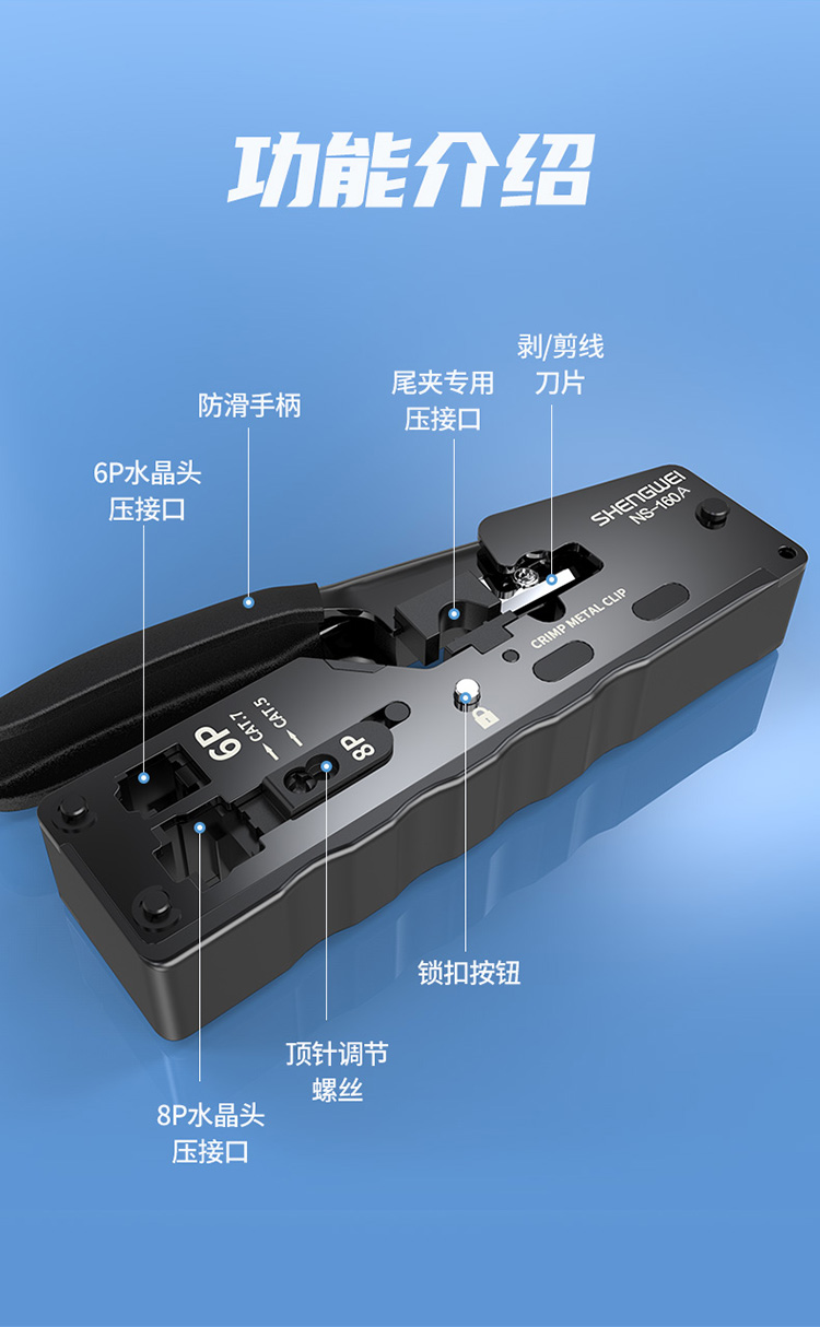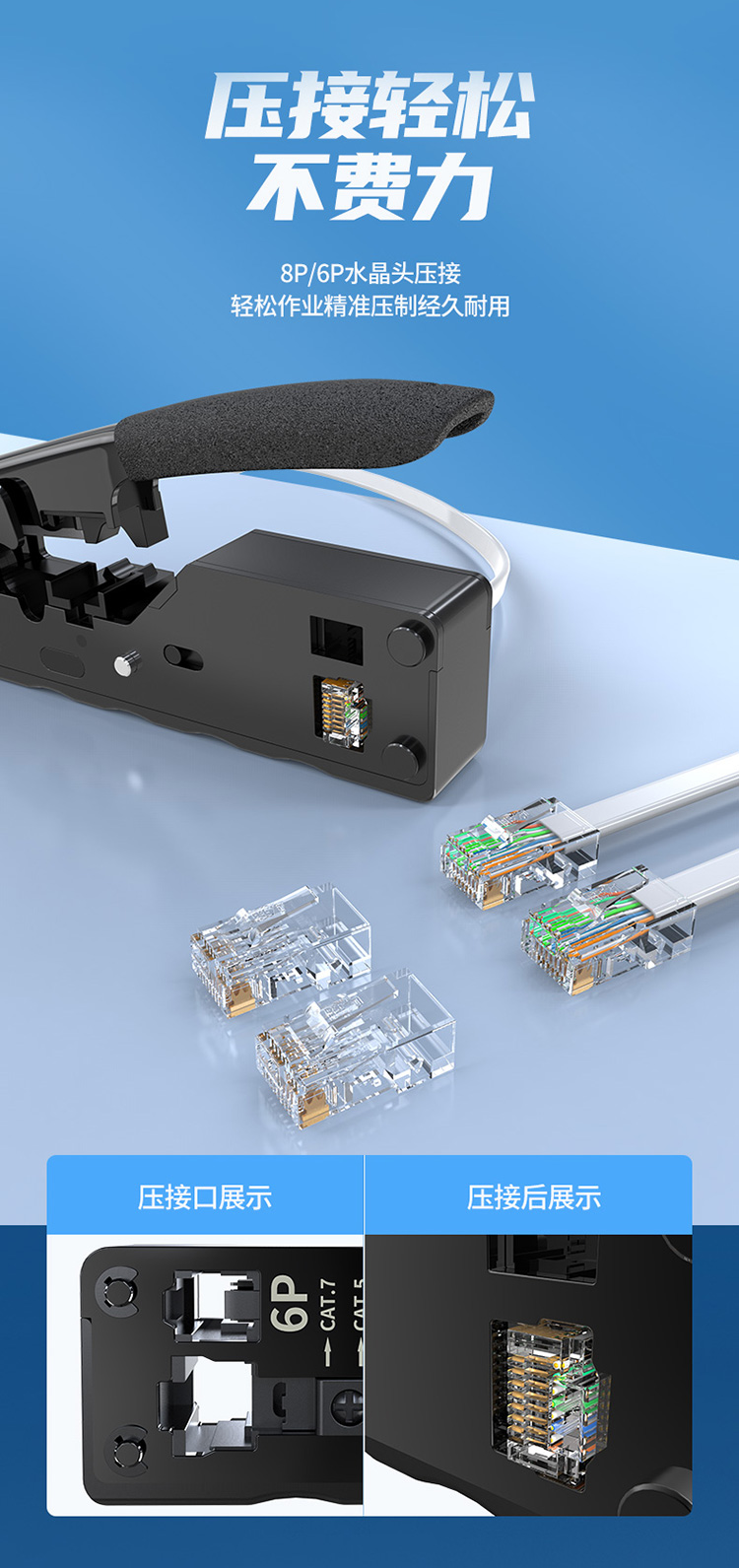 功能:壓制超五類/六類/七類,6P6C/6P4C/6P2C電話水晶頭