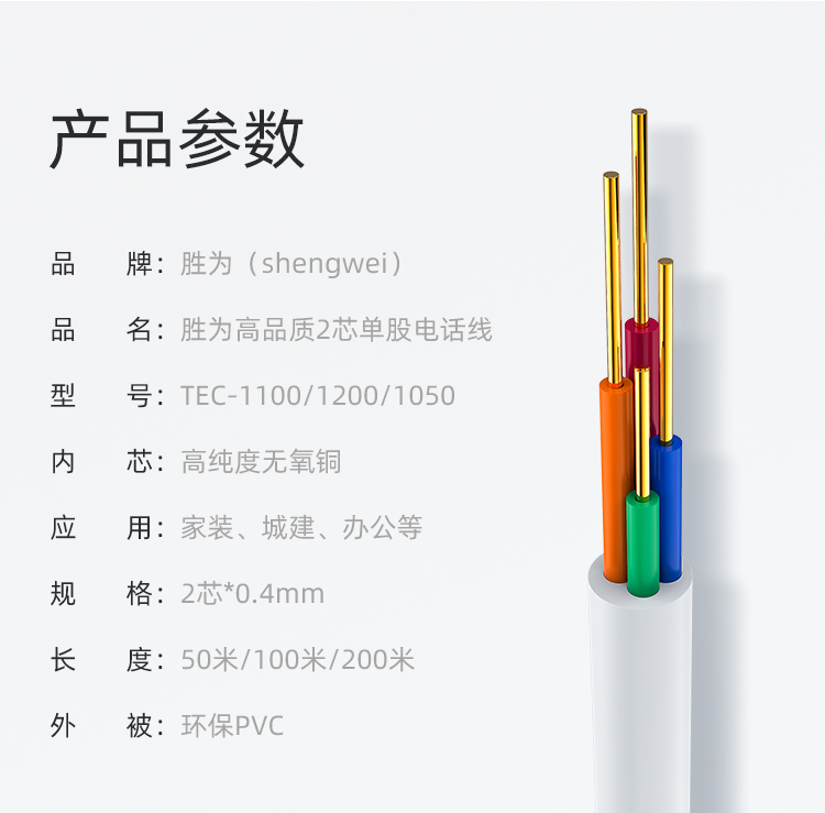 電話線2芯單股無(wú)氧銅 勝為0.4mm座機(jī)/傳真機(jī)電話線200米 TEC-1200